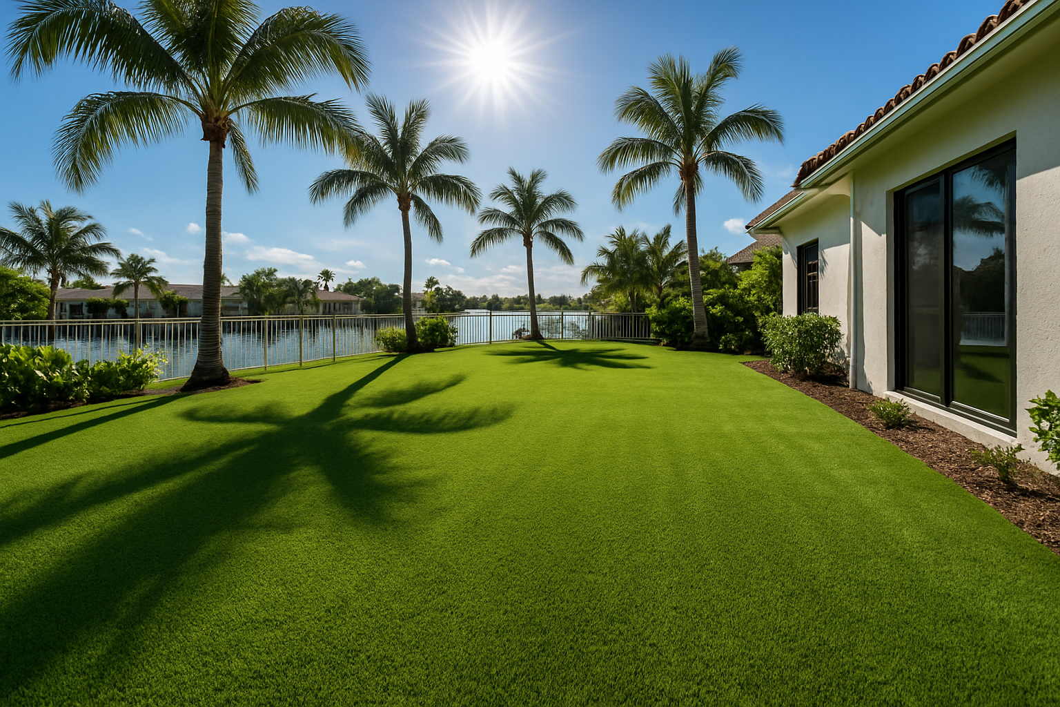 High-quality turf with UV inhibitors and lighter blade colors performs far better in South Florida’s sun than bargain turf.